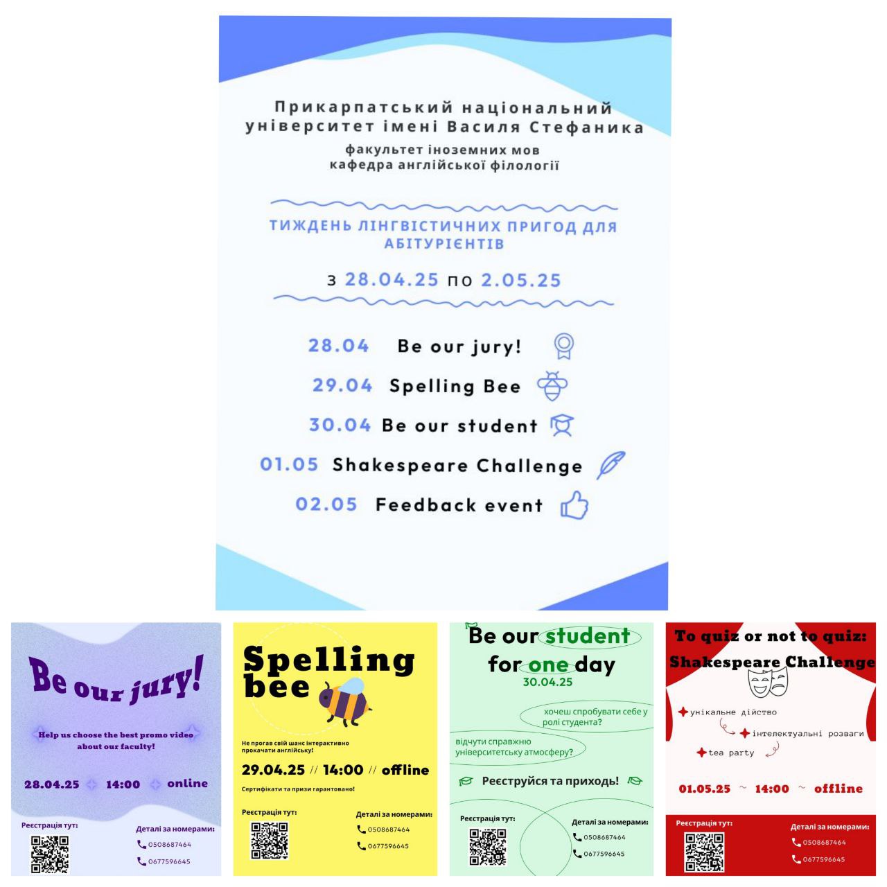 30 квітня 2025 року факультет іноземних мов запрошує тебе стати студентом на один день! Захід “BE OUR STUDENT FOR ONE DAY” розпочнеться о 10:00 – зустріч учасників біля центрального входу в університет з вул. Чорновола. У програмі: екскурсія університетом та факультетом, знайомство з викладачами, відвідування занять за розкладом разом зі студентами. Проведи цей день з нами та відчуй атмосферу університету зсередини!